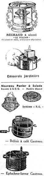 En 1923 Henri Gautreau participa au Prix Barès, concours réservé aux « inventeurs français, pères d’au moins trois enfants, qui auront fait les découvertes les plus utiles à l’industrie française ». Le quatrième prix récompensa ses inventions et en janvier 1924 celles-ci furent détaillées dans la revue Recherches et inventions. La même année 1923 la Maison Gautreau participa au premier Salon des Arts Ménagers avec le septième prix pour l’ensemble de ses articles où figurait son “éplucheur-Laveur Gautreau”. Cet original ustensile à manivelle servit ensuite de modèle à Jean Mantelet, futur Moulinex, pour la conception de son premier “Moulin-Légumes”, sur lequel il bâtira son empire. Mais ceci est une autre histoire...