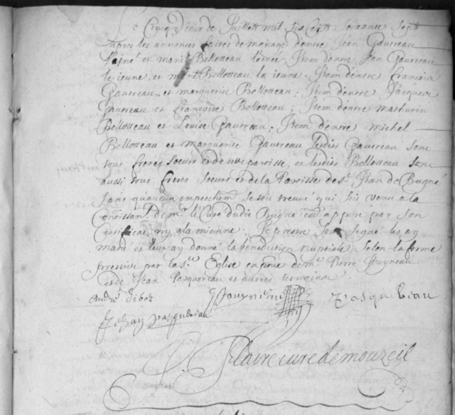 Acte de 6 mariages réciproques Gautreau / Belloteau du 5 juillet 1667 à Mouzeuil-Saint-Martin
